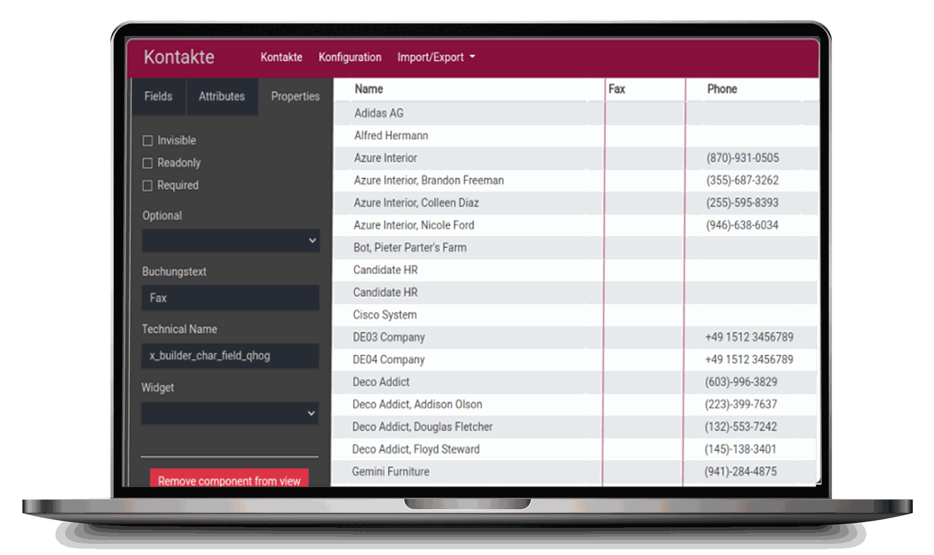 With the ITISeasy Builder, any modification you make-like adding a column (e.g., Fax)-is instantly shown in a live preview.
