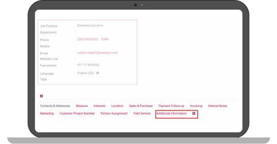 In the form view of a contact the following different fields can be inserted and changed:Char, Integer, Many2one, One2many, Many2manyIn addition the components Columns and Tabs can be added.
