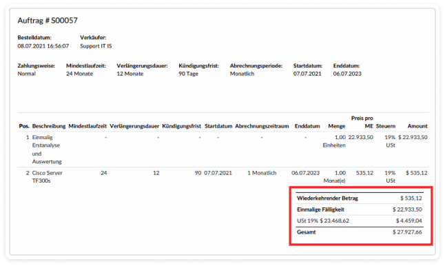 Recurring + one-time charges are combined into a total payable amount